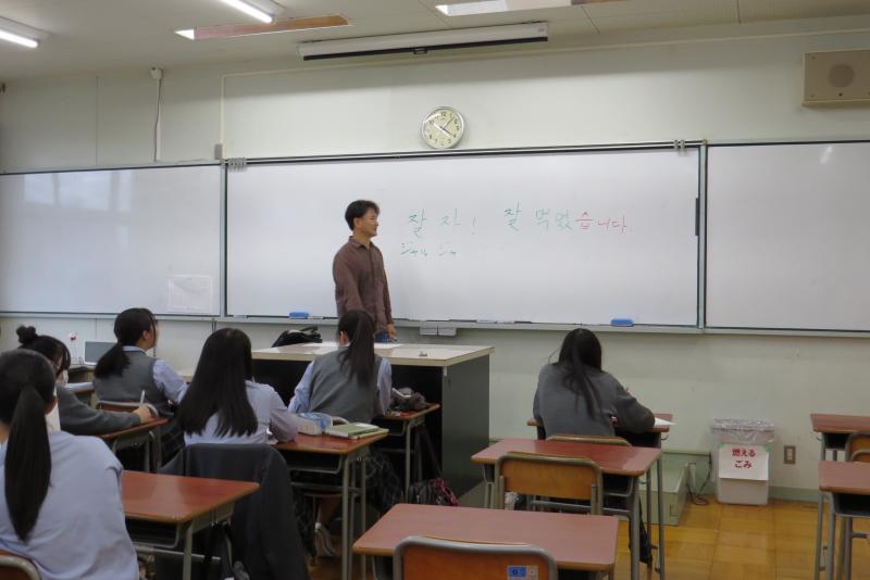 「韓国海外研修」(1月実施)の第1回目の事前研修が行われました。研修参加者24名が、本校韓国語の講師、李先生から「旅行に役立つ韓国語会話」を教わりました。
